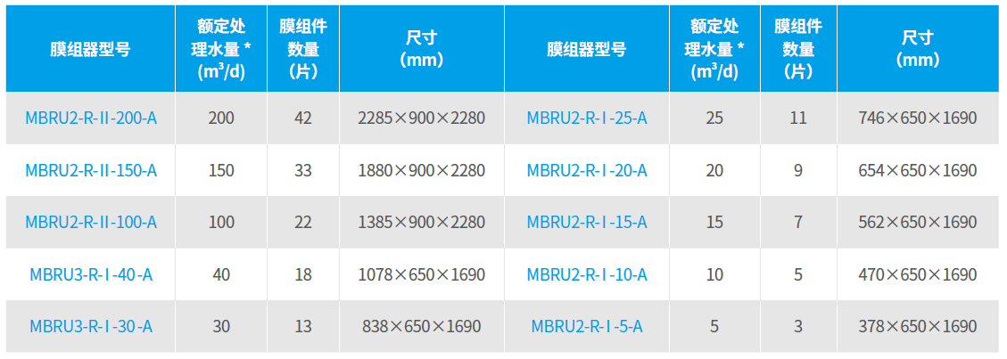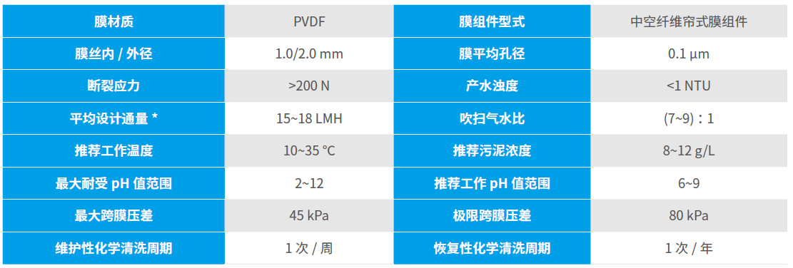 注:(1)* 水溫20 ℃、污泥濃度8~12 g/L 下的處理水量;(2)膜組器主體材質(zhì)為SUS304;